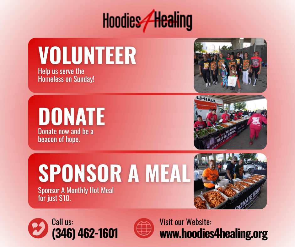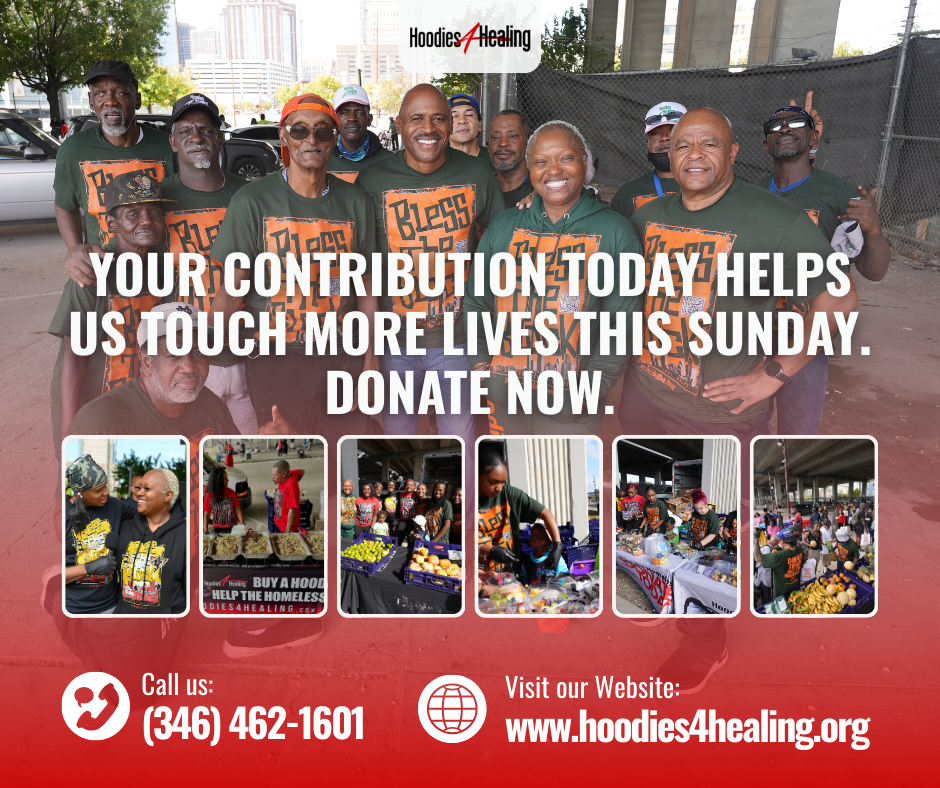 Driven by unwavering faith and a commitment to serve God's children, Hoodies4Healing isn't just about providing meals or warmth through hoodies; it's about reigniting the spirit of humanity, one act of kindness at a time. Join us as we strive to heal, uplift, and transform the Houston community through our relentless dedication and love.