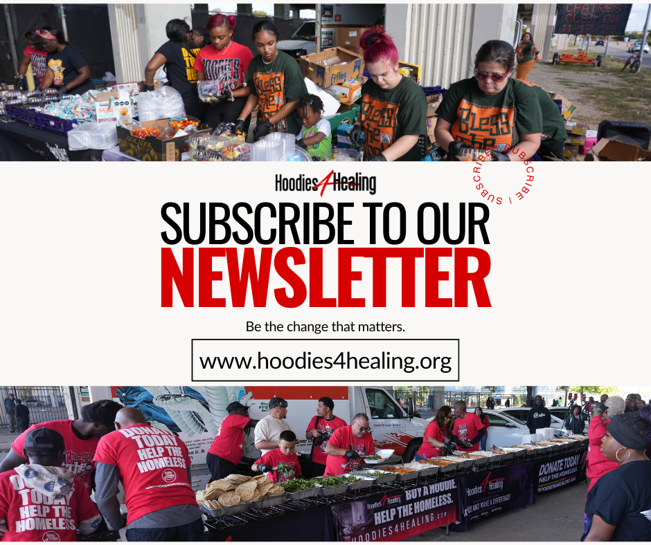 At the heart of Hoodies4Healing lies a commitment to the Houston community. Every hoodie, every meal, and every gesture stems from a desire to see a city where no one goes to sleep hungry and scared. With every purchase and donation, we inch closer to turning this vision into reality. Dive into our journey, and see the change through our Gallery.